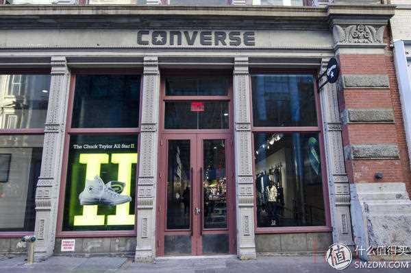 新的纽约SoHo区CONVERSE旗舰店,门脸设计很有历史感,粗大的浮雕石柱,搭配暗红色的门窗框,显得沧桑、厚重。简洁的黑色CONVERSE字样高高地刻印在正门二楼上方。店内的设计有种现代工厂的风格,黑白两色为主,充满着街头文化气息。墙壁四周按照不同风格、类别,分布着琳琅满目的CONVERSE鞋款,中间部分有一些CONVERSE的服饰产品。