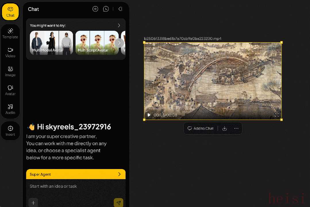 看到上面的《清明上河图》视频后,如果你也有一些灵感,想生成更具有年代感和写实的《清明上河图》,可随时添加生成的视频到 Chat,与「超级智能体」(Super Agent)对话,一起头脑风暴,激发更多灵感。