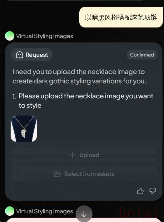 这里我们选择了「Virtual Styling Images」这个 Expert Agent,它擅长将时尚单品转化为风格鲜明、极具视觉冲击力的造型照片。然后给出简单指令 —— 以暗黑风格搭配这条项链。