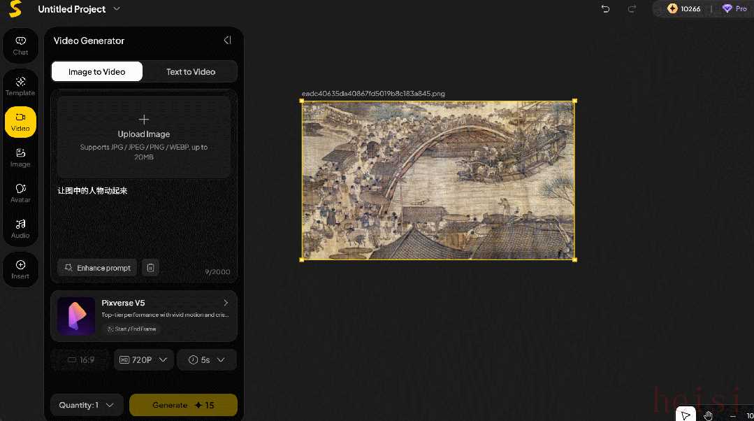 整个创作工作是流动的,比如让静态的中国名画《清明上河图》动起来,只需要将原图上传到画布,拖拽原图到图生视频功能,即可在画布生成视频。