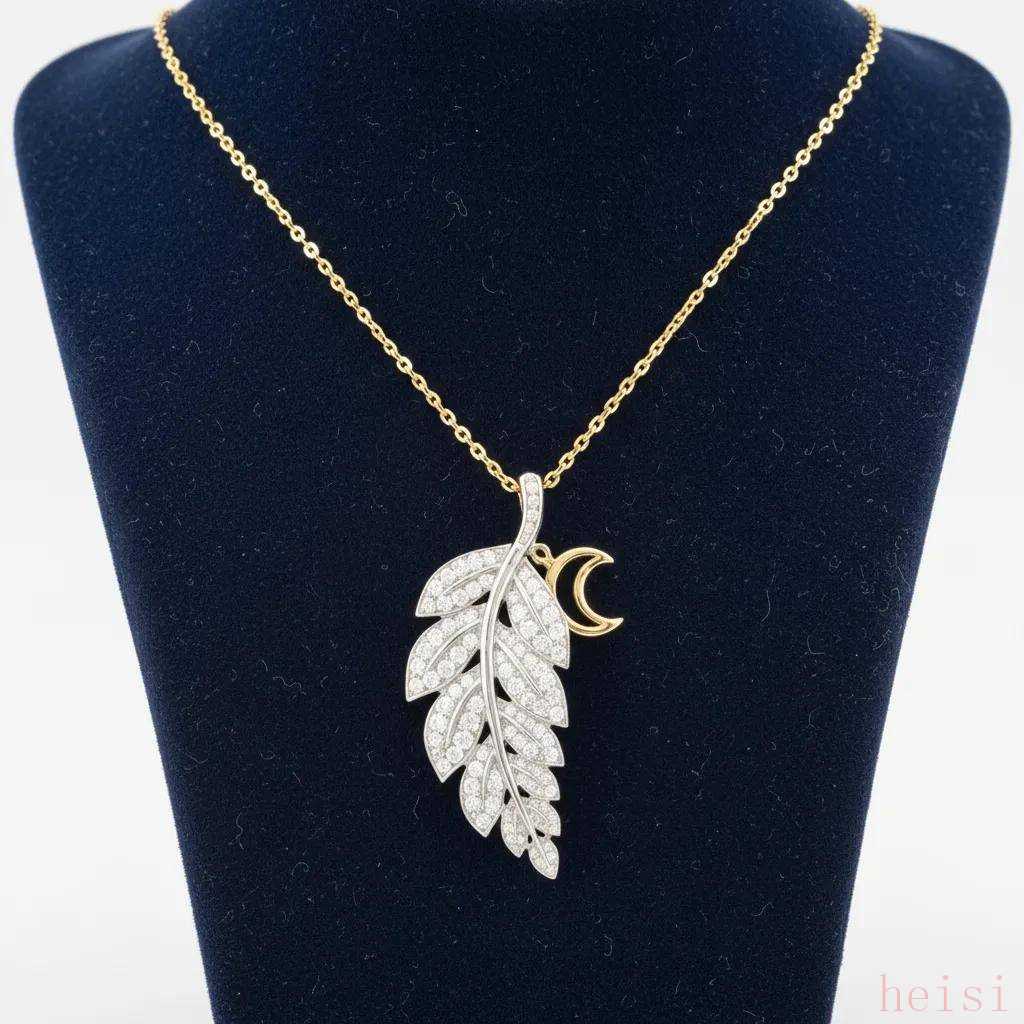 An elegant necklace with an 18K yellow gold chain and a white gold pendant shaped like a detailed laurel leaf. The leaf is studded with small round diamonds resembling stars. The pendant's reverse side features a moon silhouette cutout. Displayed on a navy blue velvet neck form. Soft, diffused lighting, ultra-high definition product photography, 8K