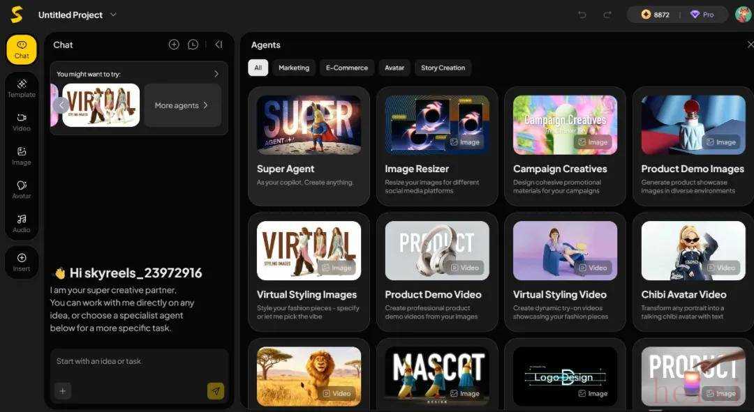 在前面的画布中,我们已经感受过 Super Agent(全能创意助手)的功能。此外,Agent 模块还包括 Expert Agents,其覆盖四大核心领域的专业团队,当你需要市场营销策略、电子商务运营、虚拟形象塑造或创意故事编写时,都能在 Agent 库中找到对应的专家,高效完成专业任务。