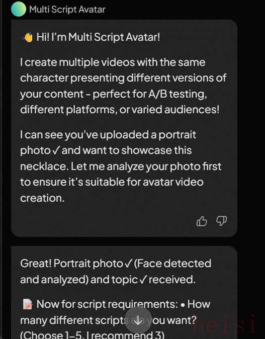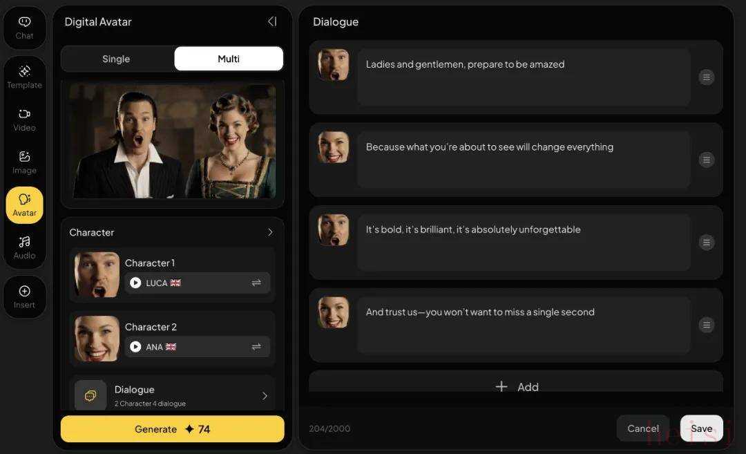 如果你觉得仅看图片还不过瘾,可以将其转换为视频。只需选择 「Multi Script Avatar」,系统就能自动为画面生成带语音解说的视频。