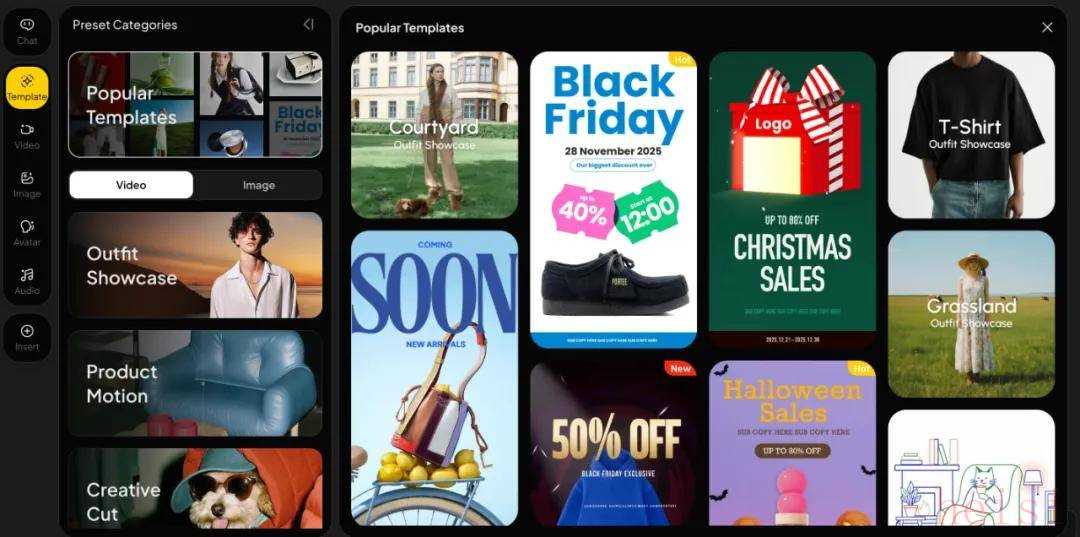 SkyReels 模板库迎来全面升级,现已收录近 10 大类、150 余种专业模板,覆盖从视觉设计到智能视频生成的全流程创作需求。