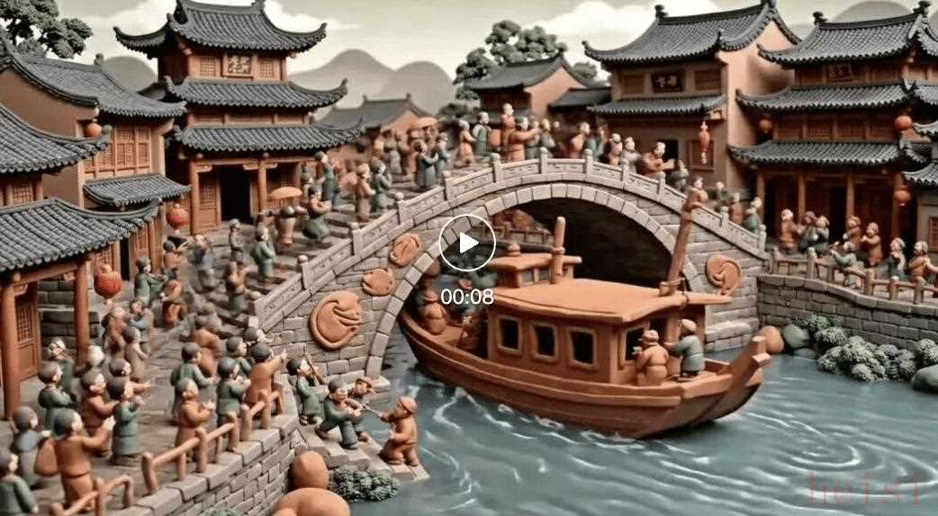 智能体就会从主题、设定、构图、色彩等多角度思考,生成另一个版本的《清明上河图》:如下是生成陶土风格的《清明上河图》。同时利用 AI 音频功能为这个视频配上古风古韵的 BGM,并能精细地将视频分辨率提升到 4K: