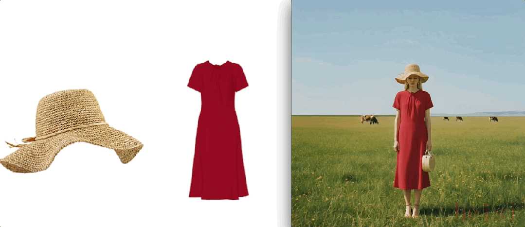 除了商品静态展示上效果突出,模版功能还支持人物动态视频,我们就拿虚拟试衣来讲吧,模板支持多件服饰(如上衣、裤子、帽子)同时试穿,这里我们上传了帽子和裙子。