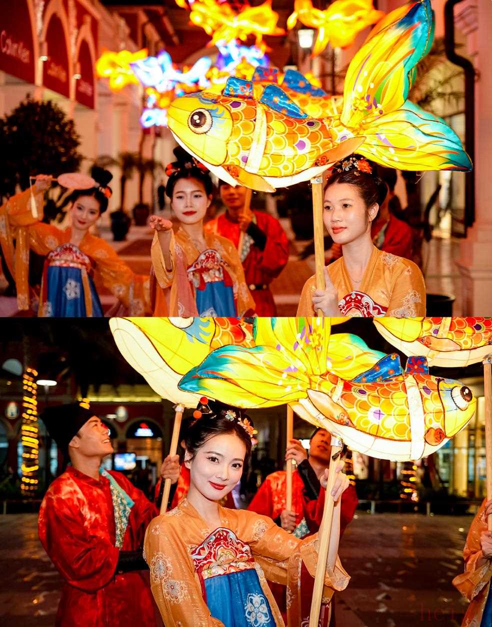 借十周年庆典契机,佛罗伦萨小镇以鱼灯为核心载体,融合中秋、国庆双节氛围打造灯光节,让市民游客领略意式风情+岭南文化的双重魅力: