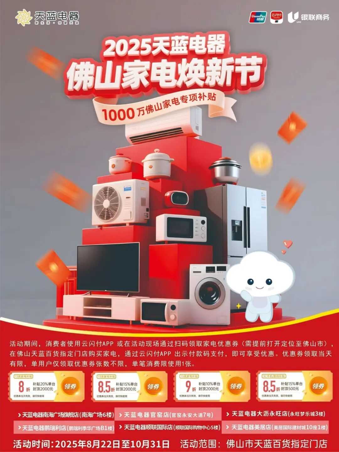 ⭐活动内容:通过云闪付发放1000万家电专项补贴!分别为8折、85折、9折家电券,单台封顶2000元!85折数码券单台封顶500元。