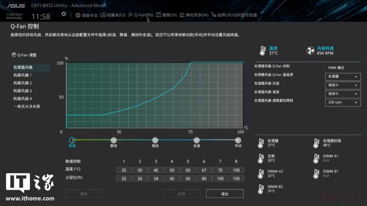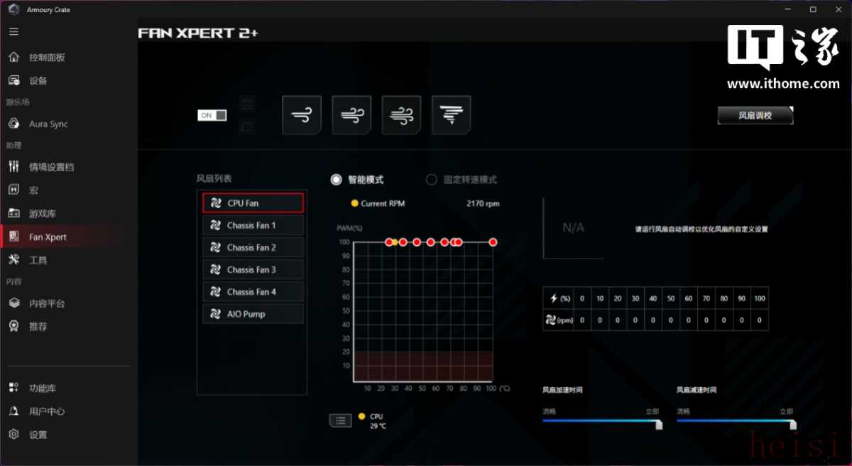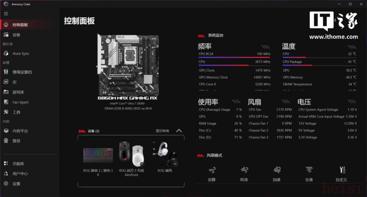 不同之处在于,奥创智控中心软件的信息展示更加简单直观,操作方便。比如首页右下角的风扇模式调节,拥有安静、标准、加速和全速四档预设模式可选,切换实时生效,不用进退 BIOS 来回重启,也无需手动调节风扇曲线。