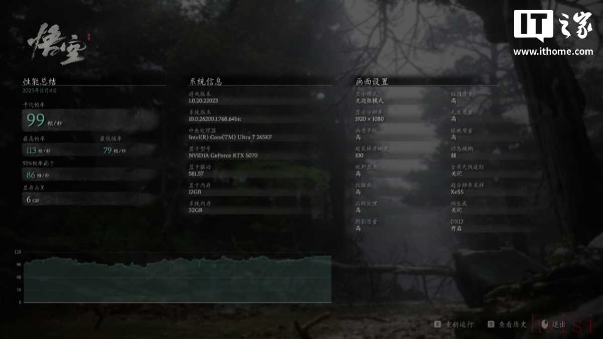 而在“众生平等”的《黑神话:》,以 1080P + 高画质 + 100% XeSS 设置,运行游戏自带的基准测试,游戏平均帧数来到 99 帧,1% Low 也有 76 帧。