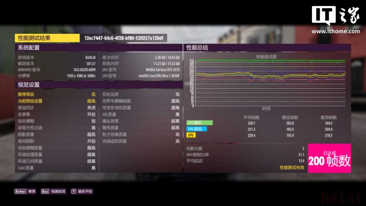 接着我们又测试了 2 款偏重光栅性能的大型单机游戏,在赛车竞速游戏《极限竞速:地平线 5》中,以 1080P 分辨率 + 极端画质预设,运行游戏自带基准测试,游戏平均帧数为 200 帧,1% Low 154 帧。