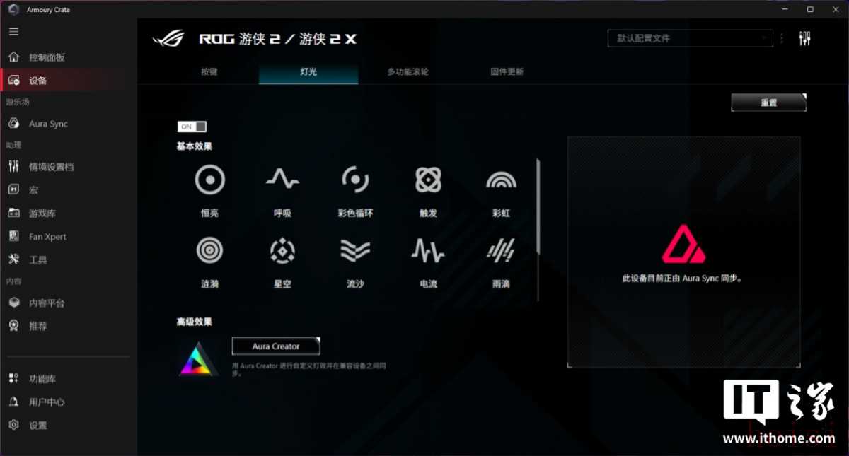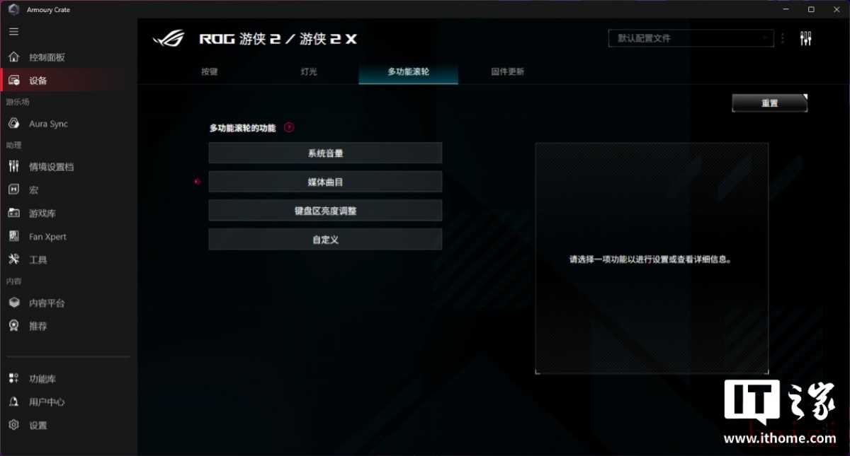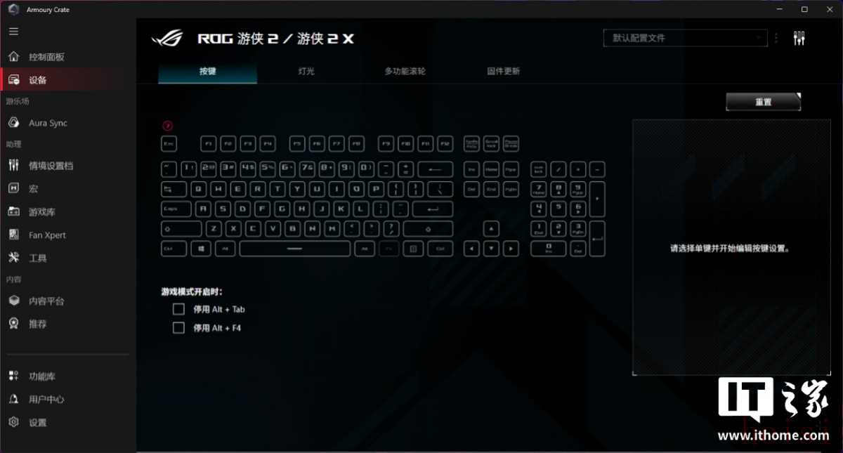 虽然操作简单,但自定义功能做得很丰富,一点也不粗糙。拿我们搭配的 ROG 游侠 2 键盘举例,它的自定义菜单中包含四个部分,分别是: