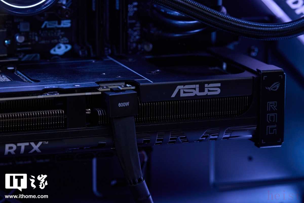显卡右侧被印有 ROG 大眼 Logo 和文字 Logo 的显卡支架稳稳托住,一直延伸到主板顶部齐平位置,让显卡的固定更加牢靠,也起到了一定的藏线作用,在运输过程中更加安全,避免像 DIY 整机邮寄那样损坏主板显卡的情况发生。