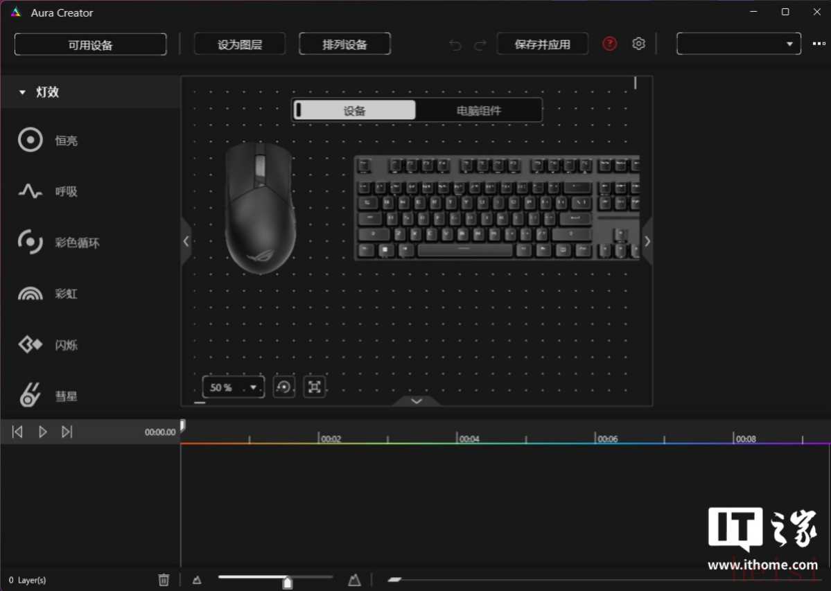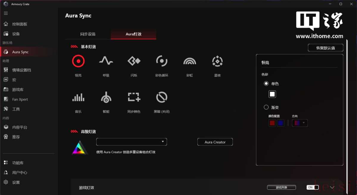 前面 BIOS 部分提到的神光同步,只需打开左侧 Aura Sync 标签,就能快速设置。所有的设备都会以模块图标方式呈现,勾选图标就能同步,既可以全局同步,也可以指定某个设备不同步。灯效的选择也很丰富,如果你很有艺术细胞,甚至可以在 Aura Creator 软件中编辑更加个性的灯效组合。