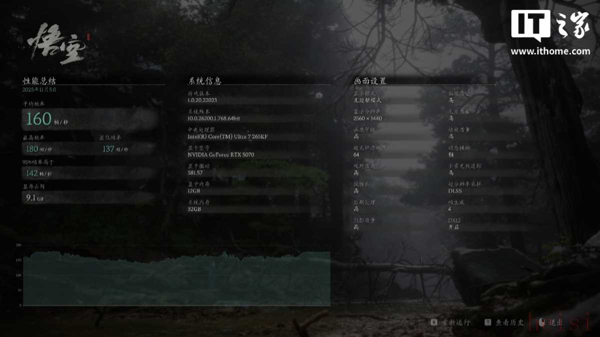 在《黑神话:》中,选择 1440P + 超高全景光线追踪 + 全高画质 + 65% DLSS 超采样 + 4x 帧生成,游戏平均帧数可达到 160 帧。