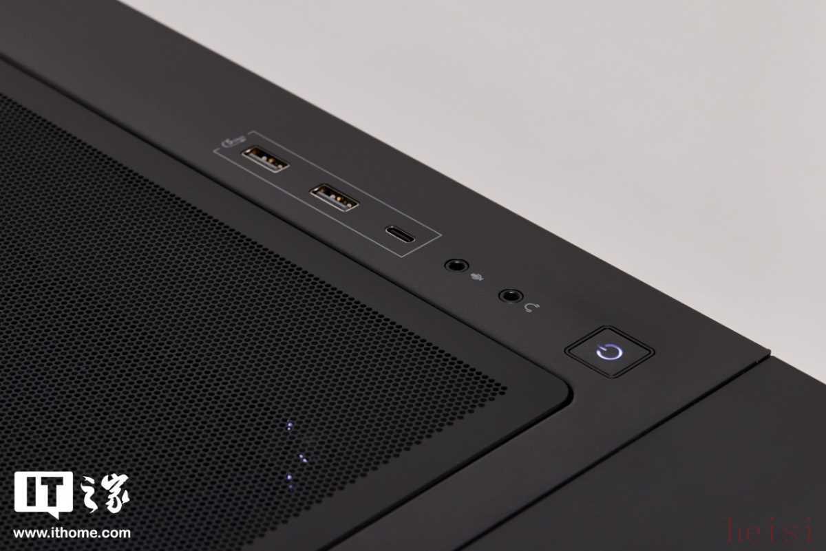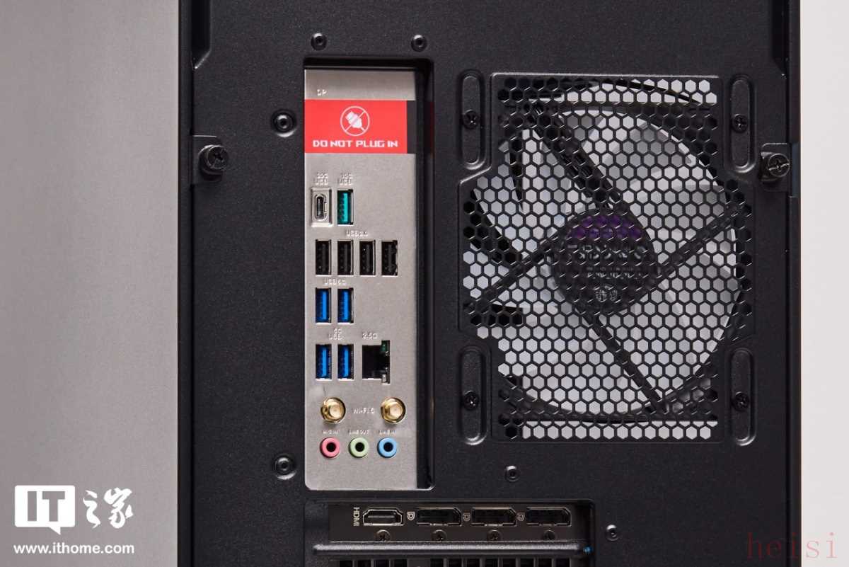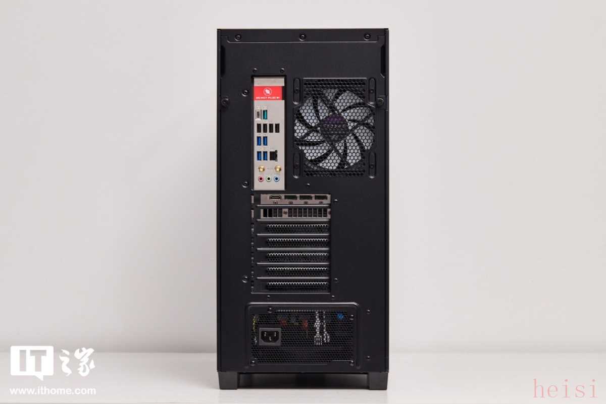 机箱背部的设计中规中矩,挡住了主板的视频输出接口,防止小白插错,I/O 接口面板的配置主打一个够用,包含: