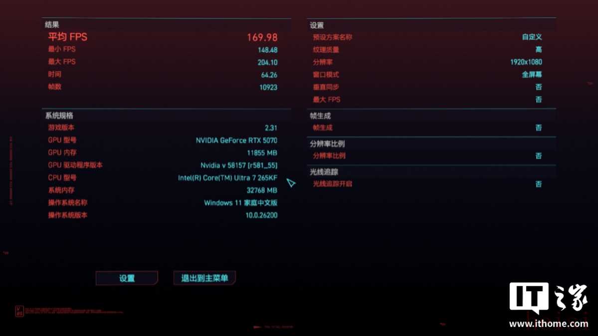 最后,我们再测试 2 款压力最大的光追游戏。在《赛博朋克:2077》中,选择 1080P 分辨率 + 超级画质预设,运行游戏自带基准测试,游戏平均帧数为 169 帧,1% Low 144 帧。