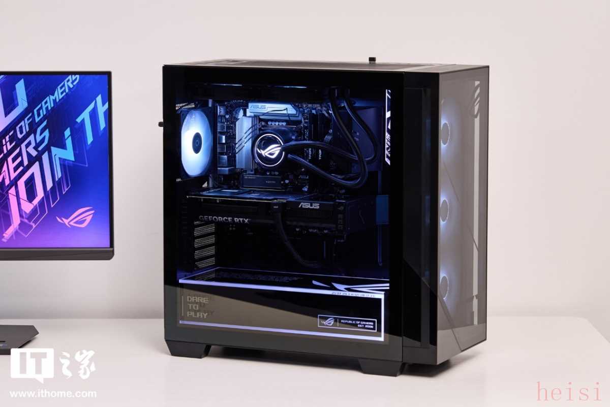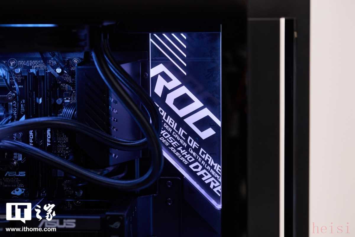 最引人注目的是机箱两侧的 ROG 霓虹灯效,支持多种灯光模式,可以通过软件进行自定义调节。在游戏过程中,灯光随着音乐的节奏闪烁,营造出一种浓厚的电竞氛围,让人热血沸腾。