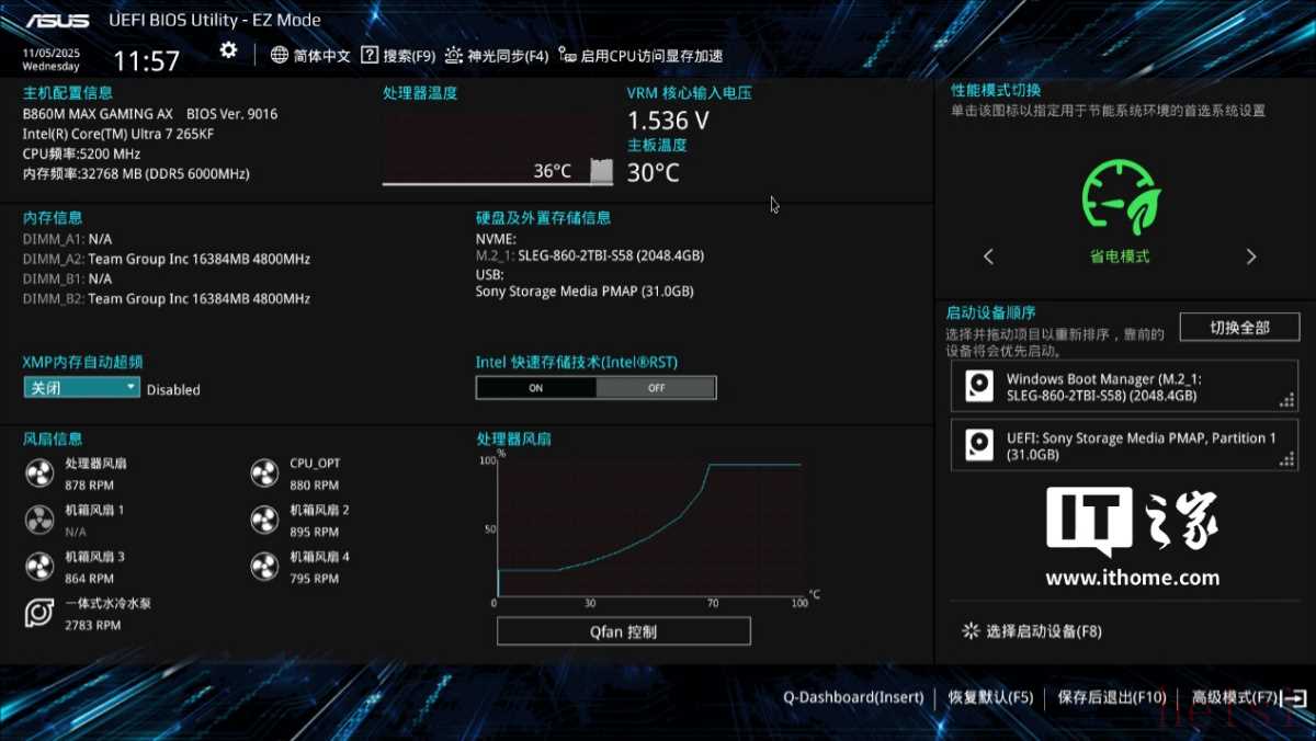 从 BIOS 界面上看,ROG 魔霸 9X 电竞主机中的这块 B860M MAX GAMING AX 主板与零售版主板几乎没有区别。只不过,品牌主机需要优先考虑硬件与系统运行的稳定性,因此没有提供超频性能模式预设,只有省电和均衡模式两档。