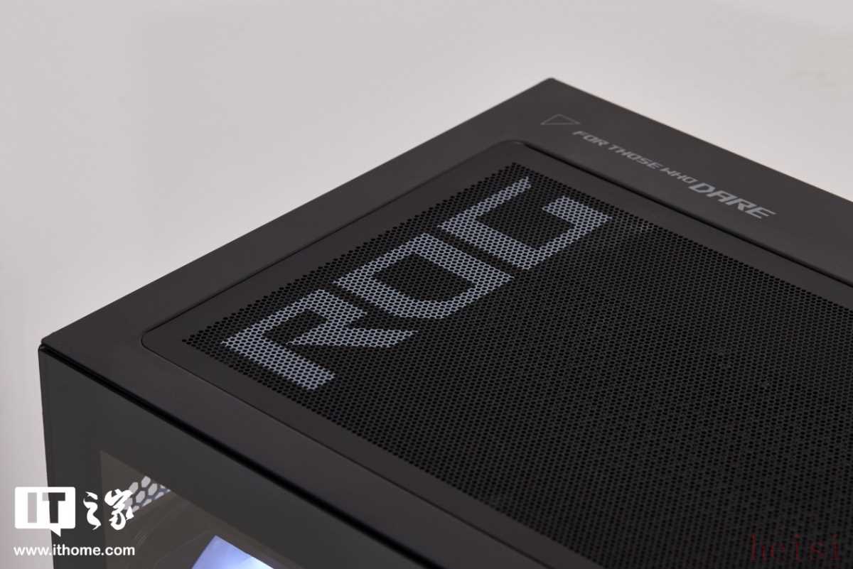 在细节装饰上,ROG 魔霸 9X 遵循非对称布局和简约几何线条处理,彰显其独特个性。机箱顶部铺有一侧印着 ROG 艺术字 Logo 的防尘网,侧边印着 "FOR THOSE WHO DARE" 经典品牌标语。顶部前侧配备 2 个 USB3.2(5G 速率)Type-A 接口和 1 个 USB3.2(5G 速率)Type-C 接口,用于连接外设 2.4G 接收器或 U 盘等设备。还有 1 组 3.5mm 麦克风和有线耳机接口,以及 1 个自带白色指示灯的方形电源键。