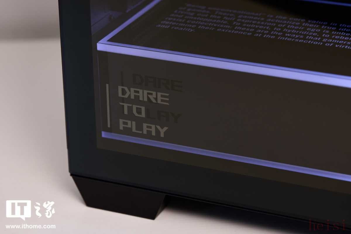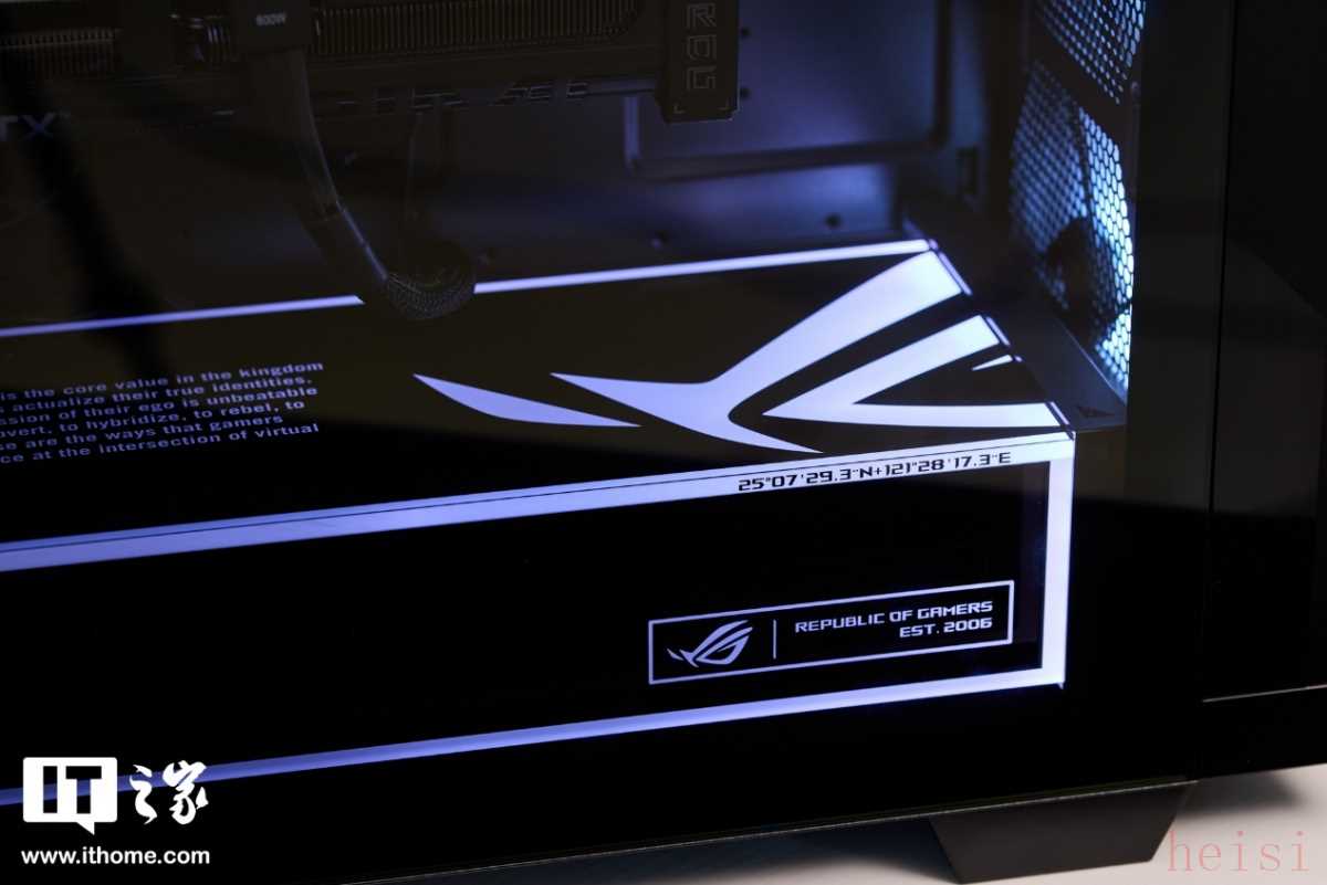 再下面是 1 个长方形的巨大灯箱,里面藏着电源仓和 SATA 硬盘仓。灯箱上做了大量会发光的装饰元素,左侧顶部的英文注释,右侧顶部的半个 ROG 大眼 Logo,侧边的 ROG 铭牌标志以及包裹整个边缘的光条,让底部空间不再有空旷感,而是被层次丰富的灯光完全充满。