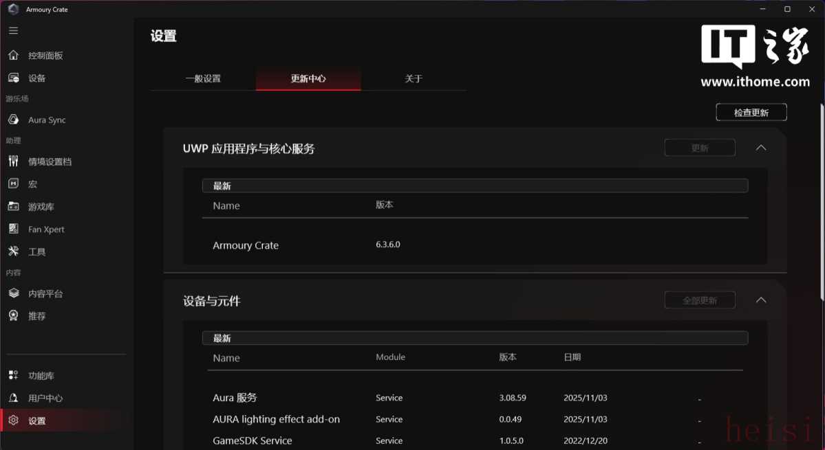 当然,最方便的还是它自带了自家品牌所有设备驱动和主板 BIOS 固件的检测和更新,免去了用户打开官网,手动搜索型号和下载安装的繁琐过程。