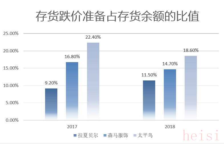 因为服装受流行趋势的影响很大,一旦出现滞销,服装企业通常会给予较大折扣,处理存货,回笼资金。因而,服装公司销售下滑后,存货跌价往往是随之而来的风险。从2016年起,拉夏贝尔的存货就一直上升,到2018年已达28亿元。但是账上只有3.3亿元的存货跌价准备。2018年和2017年,拉夏贝尔存货跌价准备与存货账面余额的比值分别为11.5%和9.2%。森马服饰2018年、2017年该比例分别为14.7%和16.8%。太平鸟2018年、2017年该比例分别为18.6%和22.4%。