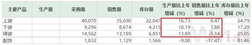 从销售量来看,拉夏贝尔的经营业绩从2017年就有减速迹象。拉夏贝尔裙装销售量下滑了5%。而营收占比最大的上装销售量只增长了6%,与此同时,当年上装的生产量增长17%。其他产品也类似,这直接导致当年各产品库存均大幅上升。由此可见,2017年起拉夏贝尔就出现了滞销的情况。