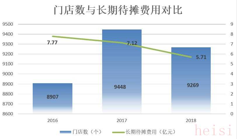 数据显示,2017年分摊在销售费用中的租赁费为10.48亿元,同比下降2%,而门店数却净增加500余家。2018年的情况也是如此,租赁费上涨0.6%,实际上门店数却下降179家。