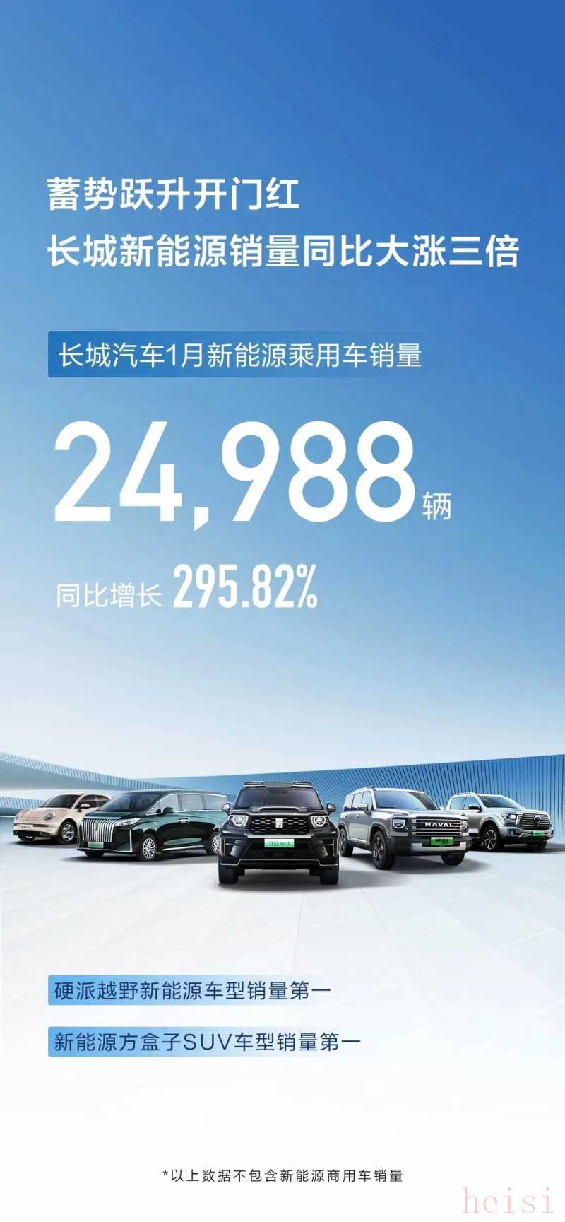 据了解,长城汽车在新能源领域布局了多款产品,像龙系列、魏牌蓝山、高山、欧拉以及坦克的新能源产品均涵盖在内。从数据来看,1月长城汽车新能源乘用车销量24988辆,同比增长295.82%。