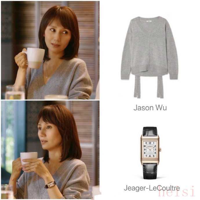 图中这件灰色v领毛衣就是Jason wu的单品,宽松而知性,搭上jeager-lecoultre的方面手表,松紧结合,精致感只增不减。