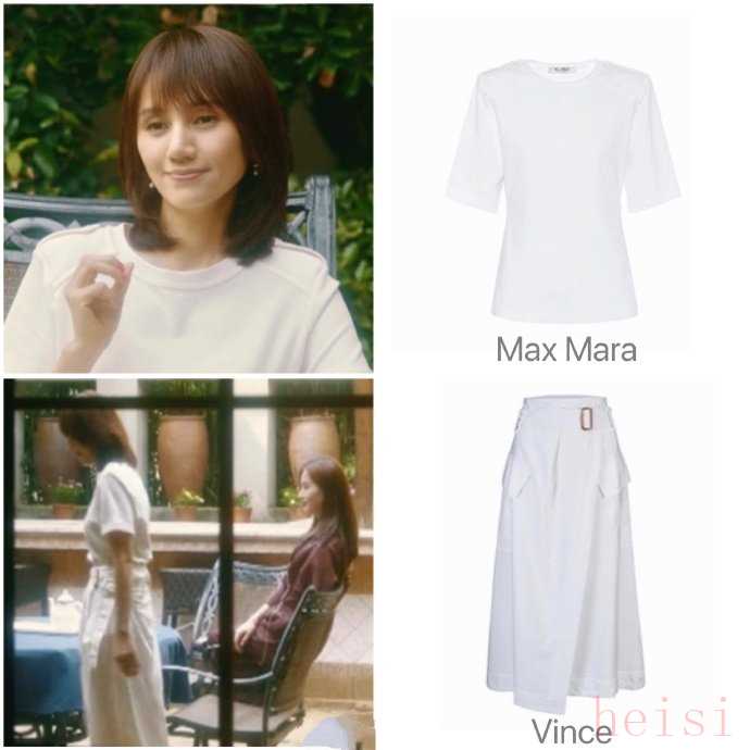 另外,同色不同质的设计,一向的服装美学中爱用的技巧,下面这一套剧中穿搭就用这了这个技巧。选取纯净简洁的白色为主色,max mara的基础款白色T恤,以良好的剪裁和版型,显现出袁泉的身材,又不会让人觉得喧兵夺主。下半身vince白色长裙,硬挺的衬衫质地,与上半身的T恤形成对比,总体简约利落又大气,一眼看去,颇有日系设计的风范呢!