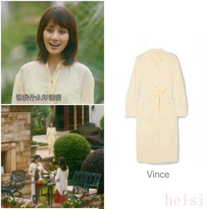 这套vince的米黄色的衬衫裙,就是她在家中花园里的穿着。衬衫小低领、微微落肩,稍有褶皱的亚麻布料,都给人一种闲适温柔之感,裙身整体微微收腰,与小灯笼袖口呼应,有型得像个温润的瓷瓶,极具浪漫美学的味道。