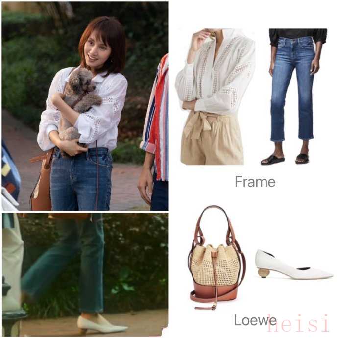 图中的白色衬衫和微喇牛仔裤都是frame家的,灯笼袖的v字领白衬衫有一些宫廷风味,加上这些条状的波点镂空,给人清透又特别的感觉。及踝的微喇牛仔裤也很好地修饰了腿型,让整个线条更加流畅活泼。配上棕色的皮革编织水桶包和一双具有设计感的白色木制圆跟小皮鞋,整个人精致、青春又独具特色。这样实用百搭的穿搭,集美们学会了嘛!