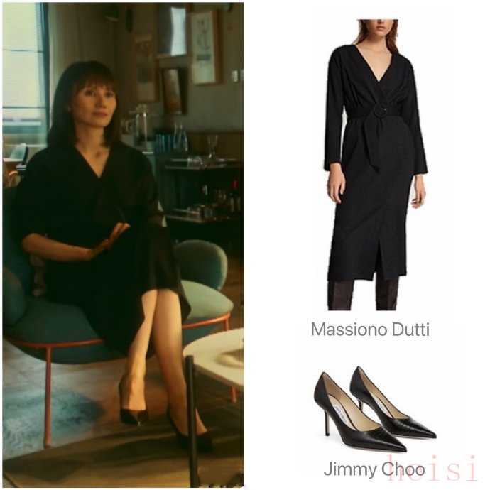 下面这一套,就是典型的职场谈判装。Massiono dutti的纯黑的挂件v领连衣裙,严肃而有气场,腰间适度的褶皱,有透出一丝松弛从容。脚踩大名鼎鼎的Jimmy Choo的黑色尖头细高跟,显得精致而干练,与身上的连衣裙呼应又有对比,张弛有度,稳重而自信,绝对是职场女孩压场子的战袍战鞋。