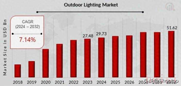 - Market Research Future数据显示,2024年户外照明市场价值达297.3亿美元,预计以7.14%年复合增长率到2032年达516.2亿美元。户外LED照明、探险照明灯等相关设备需求带动市场不断增长。