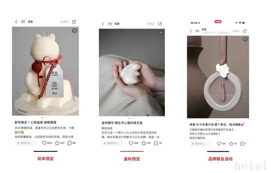 在延伸产品设计上,根据传统节日和四季节气发布限定产品,如:虎年老虎香薰蜡烛、情人节限定礼盒、桂花兔精油香砖等,创意化的产品带来新的传播热度。