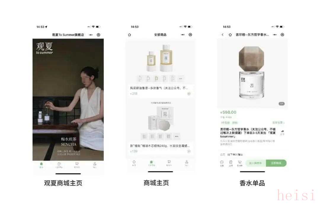 目前,观夏没有上架大型电商平台,而是充分利用私域流量。通过小红书、微信公众号将流量引向小程序店铺,在私域里做转化。