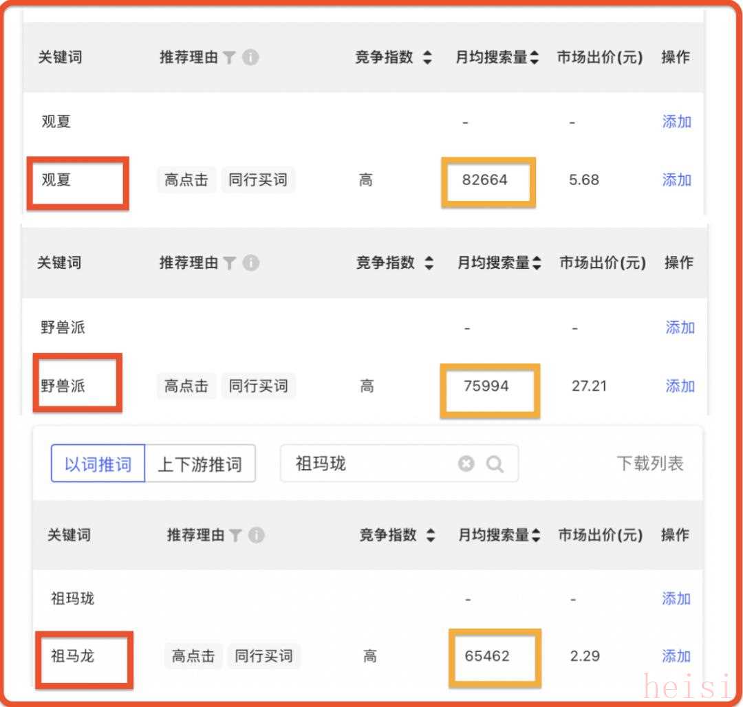 通过关键词规划工具检索观夏和同类品牌野兽派,祖玛珑热度情况,观夏搜索搜索最高,每月搜索近8W多,可见用户对观夏关注度高。