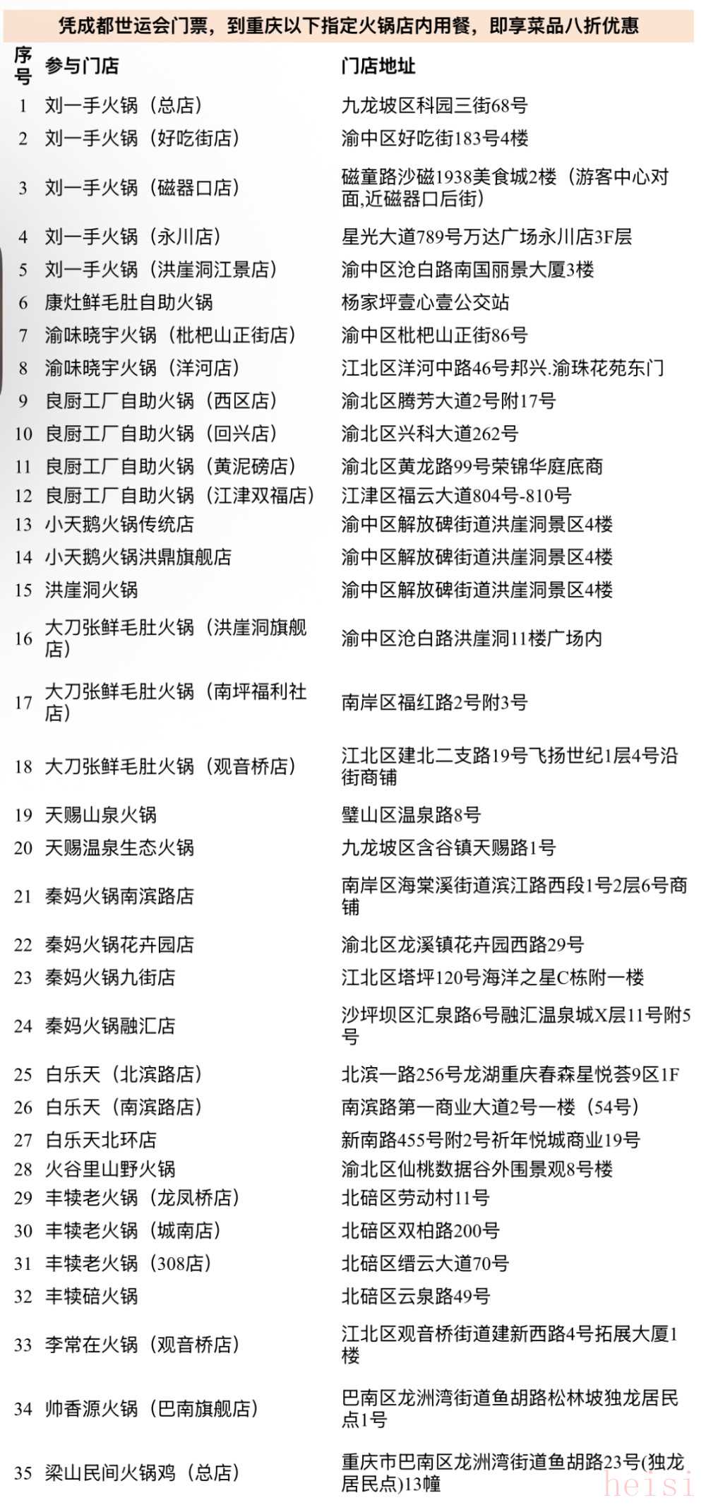 世运会观众凭任意场次门票,在刘一手火锅(总店)、渝味晓宇火锅(枇杷山正街店)、小天鹅火锅传统店、大刀张鲜毛肚火锅(洪崖洞旗舰店)、大刀张鲜毛肚火锅(南坪福利社店)、秦妈火锅(花卉园店)、白乐天(北滨路店)、梁山民间火锅鸡(总店)等多家指定门店用餐,均可享受菜品八折优惠。