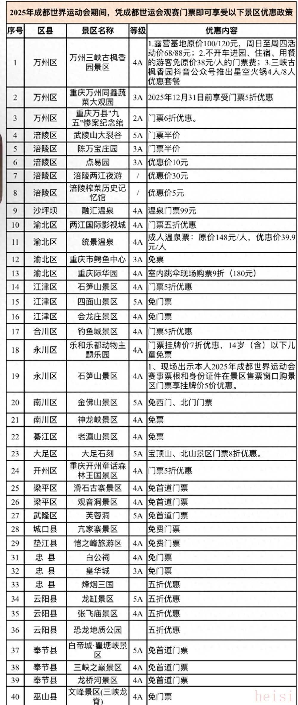 为助力国际体育盛事,展示重庆旅游形象,2025年成都世界运动会期间,重庆52家旅游景区针对世运会观赛游客推出免门票、五折优惠等重磅景区优惠政策(详见附表),包括5A级景区10家、4A级景区29家、3A级景区5家,凡持有2025成都世运会赛事门票的观众,凭票根可享受景区门票特惠(每张票根限享1次优惠)。