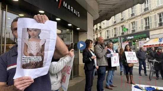 (BHV百货门口,抗议者手举着Shein平台上发现类似“儿童性玩偶”照片)
