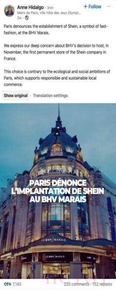 (巴黎市长对Shein入驻BVH百货的公开谴责)