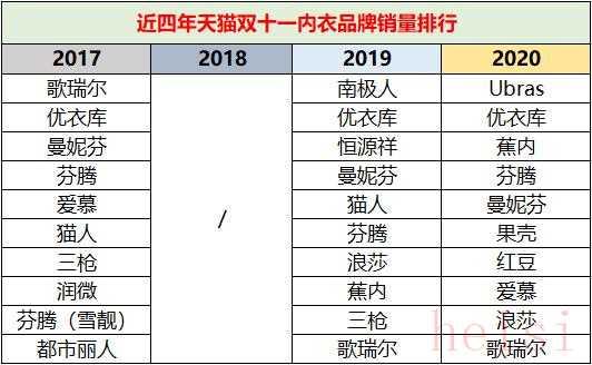 一直到2017年,“老网红”都市丽人都还榜上有名。而即便是在新内衣品牌崛起的这两年,传统品牌芬腾、恒源祥、南极人都依然在榜。就连同为老品牌的红豆今年也首次登榜,并且一举拿下了第六名的好成绩。