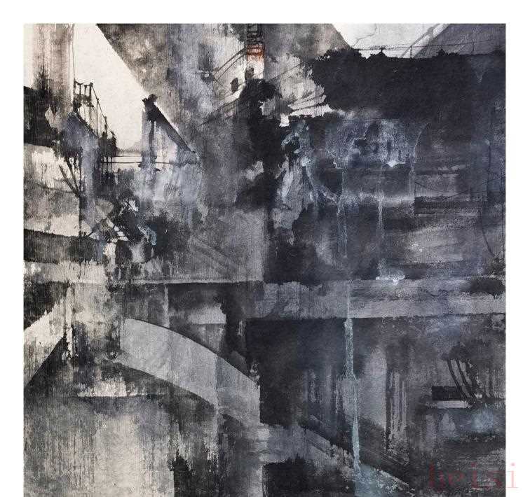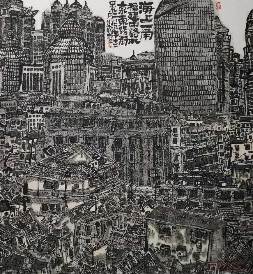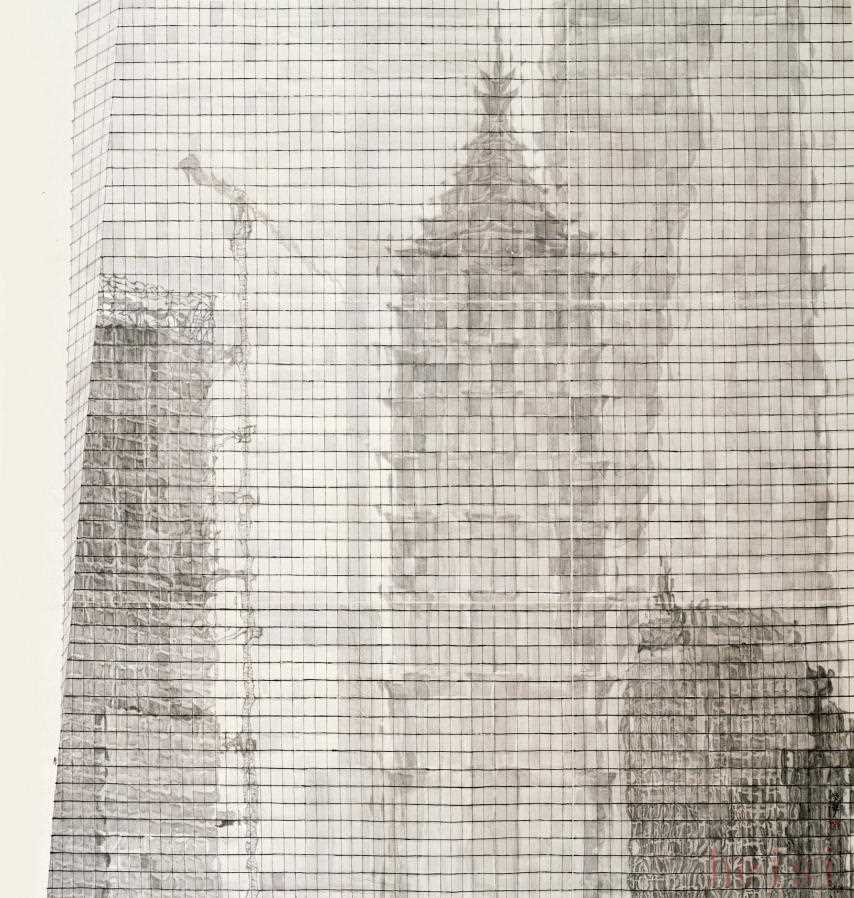 倪巍的城市水墨则是另一种视觉语言,他的画面通过繁复的的墨线交织建构成城市的肌理,与传统水墨留白、以少胜多的方式相反,以不断走高、走密、走向繁复无尽的线条表现城市建筑,庞大的体量带来的是视觉的震撼与压力,反映出对于城市的内心感受与潜在理解。