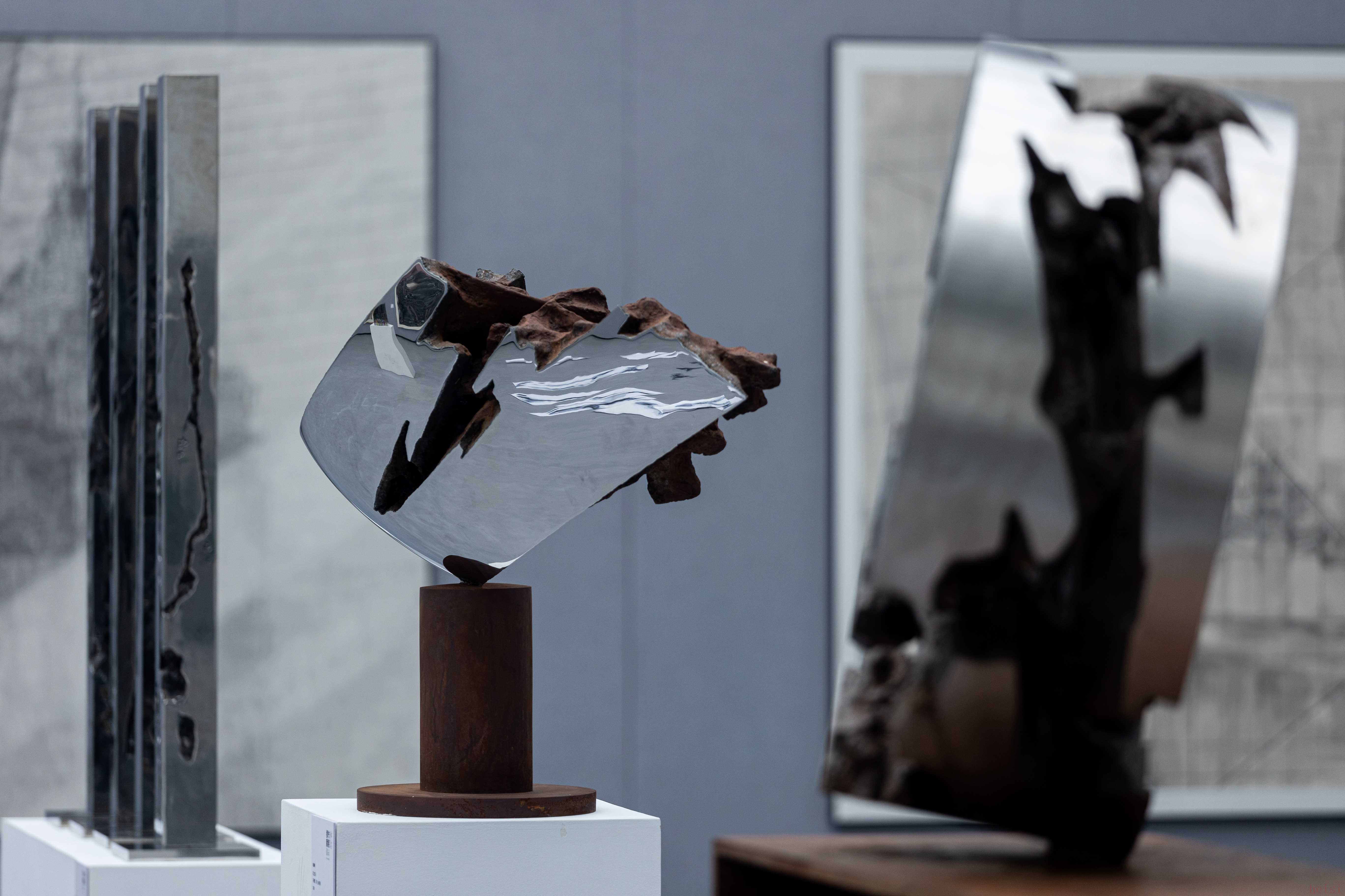 展览突破了往届“水+墨”展的平面展示方式,以雕塑作品将水墨空间立体化呈现,拓展了“水+墨”的外延。青年雕塑家庞海龙的作品《still-life》以灰尘为媒介,通过这种特别的当代水墨语言完美地融合了时间与空间,将水墨空间花园搬进了本次展览现场。在庞海龙看来,灰尘具有双重性,看似微不足道,当它经过时间的沉淀,灰尘就会呈现出一种压倒性力量,庞大且不容忽视。而冯崇利在其作品《风之痕》中以写意的手法展现了大自然的崇高与神秘,作品中蕴含的张力,极强地表达了矛盾、相容、冲撞与共生的文化意象,融入环境,引人思考“自然与人文、物质与精神”的永恒主题。