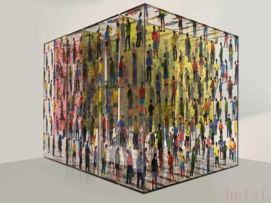 青年艺术家孙源的作品则是围绕都市人物景观,把平面的水墨作品转换为彩色的立体装置作品,一组组人群在现实与想象之间行走。她将玻璃彩绘形式呈现的亚克力六面绘装置作品,以透明材质为介质,借以光完成作品在不同光线、光照角度及空间中的视觉性。光的穿透力将作品中的芸芸众生照射在作品以外的空间中,形成新的外延与对话。