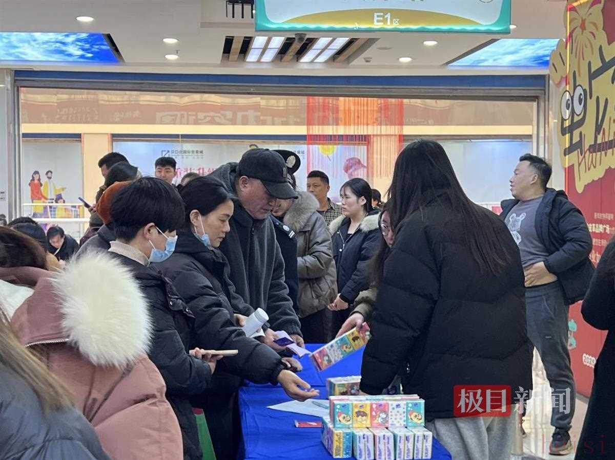一边是喜庆热闹的汉口北新春年货节,一边是激动刺激的汽车大奖。在汉口北海宁皮革品牌广场三楼服务台前,消费者们排着长队领取抽奖券。