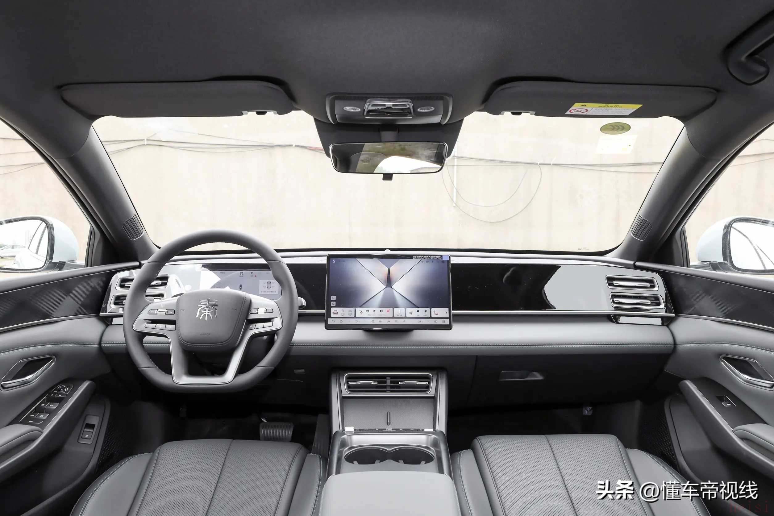 2026款比亚迪秦L DM-i内饰风格同样基本不变,包含皓月米、玄武灰两种内饰颜色。新车标配8.8英寸嵌入式全液晶仪表、12.8英寸中控屏,配备平底式皮质方向盘(领先版带方向盘智驾拨片),但换装了怀挡式换挡杆,副仪表台区物理按键域相应调整。