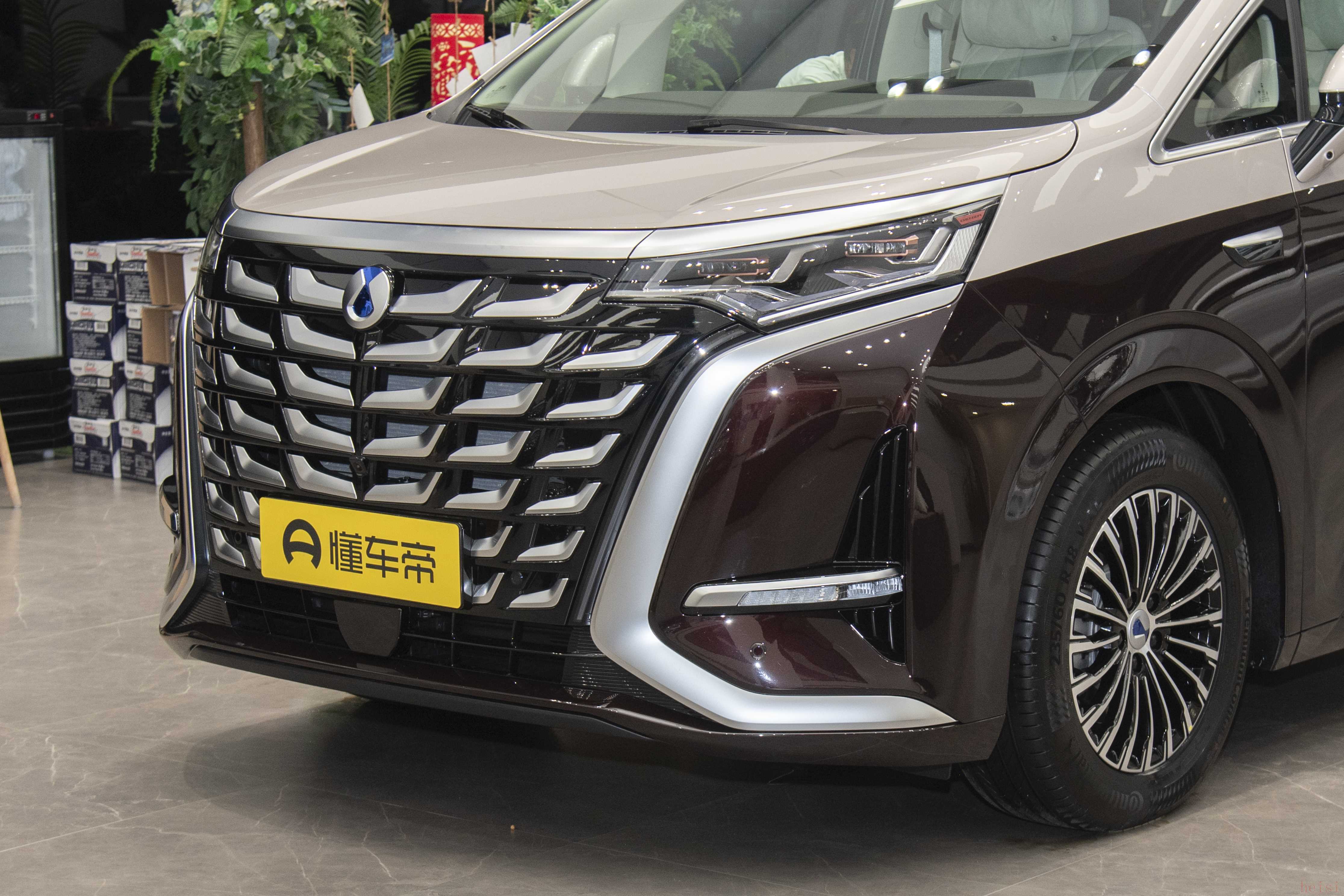 具体来看,腾势D9 DM-i四驱至尊型采用了金色/紫色搭配的双拼色车漆,前脸造型与此前已发售的车型保持一致,前格栅内部配有矩阵式排列的“L”型镀铬饰条,两侧还配有粗壮的“C”型饰条。